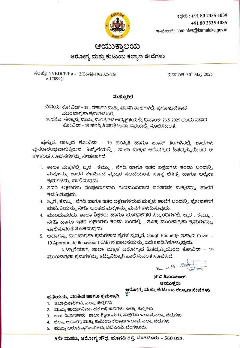 ಬೆಂಗಳೂರು : ರಾಜ್ಯದಲ್ಲಿ ಕೋವಿಡ್-19 ಪ್ರಕರಣಗಳ ಸಂಖ್ಯೆ ಮತ್ತೆ ಏರುತ್ತಿರುವ ಹಿನ್ನೆಲೆ, ಮಕ್ಕಳ ಆರೋಗ್ಯ ಮತ್ತು ಸುರಕ್ಷತೆಯನ್ನು ಖಚಿತಪಡಿಸಿಕೊಳ್ಳಲು ಆರೋಗ್ಯ ಮತ್ತು ಕುಟುಂಬ ಕಲ್ಯಾಣ ಸೇವೆಗಳ ಆಯುಕ್ತಾಲಯವು ಶಾಲೆಗಳಿಗೆ ಹೊಸ ಮಾರ್ಗಸೂಚಿಗಳನ್ನು ಪ್ರಕಟಿಸಿದೆ.