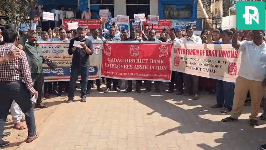 ಗದಗ: ದೇಶಾದ್ಯಂತ ಬ್ಯಾಂಕ್ ನೌಕರರ ಮುಷ್ಕರ ಹಿನ್ನೆಲೆಯಲ್ಲಿ ಗದಗ ಜಿಲ್ಲೆಯಲ್ಲೂ ಬ್ಯಾಂಕ್ ನೌಕರರಿಂದ ಮುಷ್ಕರ ಮಾಡಲಾಗಿದೆ. ಗದಗ ನಗರದ ಮಹಾತ್ಮಾ ಗಾಂಧಿ ವೃತ್ತದ ಬಳಿಯ ಕೆನರಾ ಬ್ಯಾಂಕ್ ಆವರಣದಲ್ಲಿ ಮುಷ್ಕರ ನಡೆದಿದ್ದು, ವಾರಕ್ಕೆ ಐದು ದಿನ ಮಾತ್ರ ಕೆಲಸದ ದಿನ ಮಾಡುವಂತೆ ಪ್ರತಿಭಟನಾಕಾರರು ಆಗ್ರಹಿಸಿದ್ದಾರೆ.