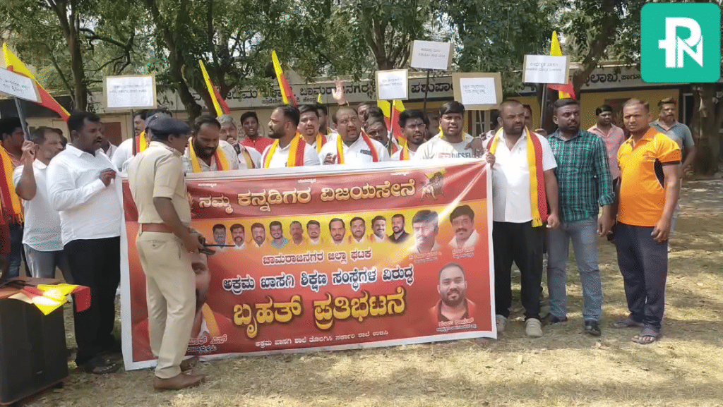 ಚಾಮರಾಜನಗರ : ಜಿಲ್ಲೆಯಲ್ಲಿ ಅಕ್ರಮವಾಗಿ ಕಾರ್ಯನಿರ್ವಹಿಸುತ್ತಿರುವ ಖಾಸಗಿ ಶಾಲೆಗಳ ವಿರುದ್ಧ ಕಠಿಣ ಕ್ರಮ ಕೈಗೊಳ್ಳುವಂತೆ ಆಗ್ರಹಿಸಿ ನಮ್ಮ ಕನ್ನಡಿಗರ ವಿಜಯಸೇನೆ ಸಂಘಟನೆ ಕಾರ್ಯಕರ್ತರು ನಗರದಲ್ಲಿ ಪ್ರತಿಭಟನೆ ನಡೆಸಿದರು.