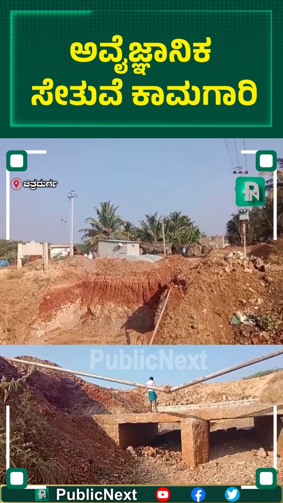ಚಿತ್ರದುರ್ಗ ಜಿಲ್ಲೆಯ ಚಳ್ಳಕೆರೆ ತಾಲೂಕಿನ ಚೌಳೂರು ಗ್ರಾಮ ಪಂಚಾಯಿತಿ ವ್ಯಾಪ್ತಿಯ ಬಸವೇಶ್ವರ ಕಾಲೋನಿ ಸಮೀಪ, ರಾಧಾಸ್ವಾಮಿ ಆಶ್ರಮದ ಮುಂಭಾಗದಲ್ಲಿರುವ ಟಿ.ಎನ್.ಕೋಟೆ ರಸ್ತೆಯ ಶಿಥಿಲಾವಸ್ಥೆಯಲ್ಲಿರುವ ಸೇತುವೆಯನ್ನು ಸಂಪೂರ್ಣವಾಗಿ ತೆರವುಗೊಳಿಸದೆ,