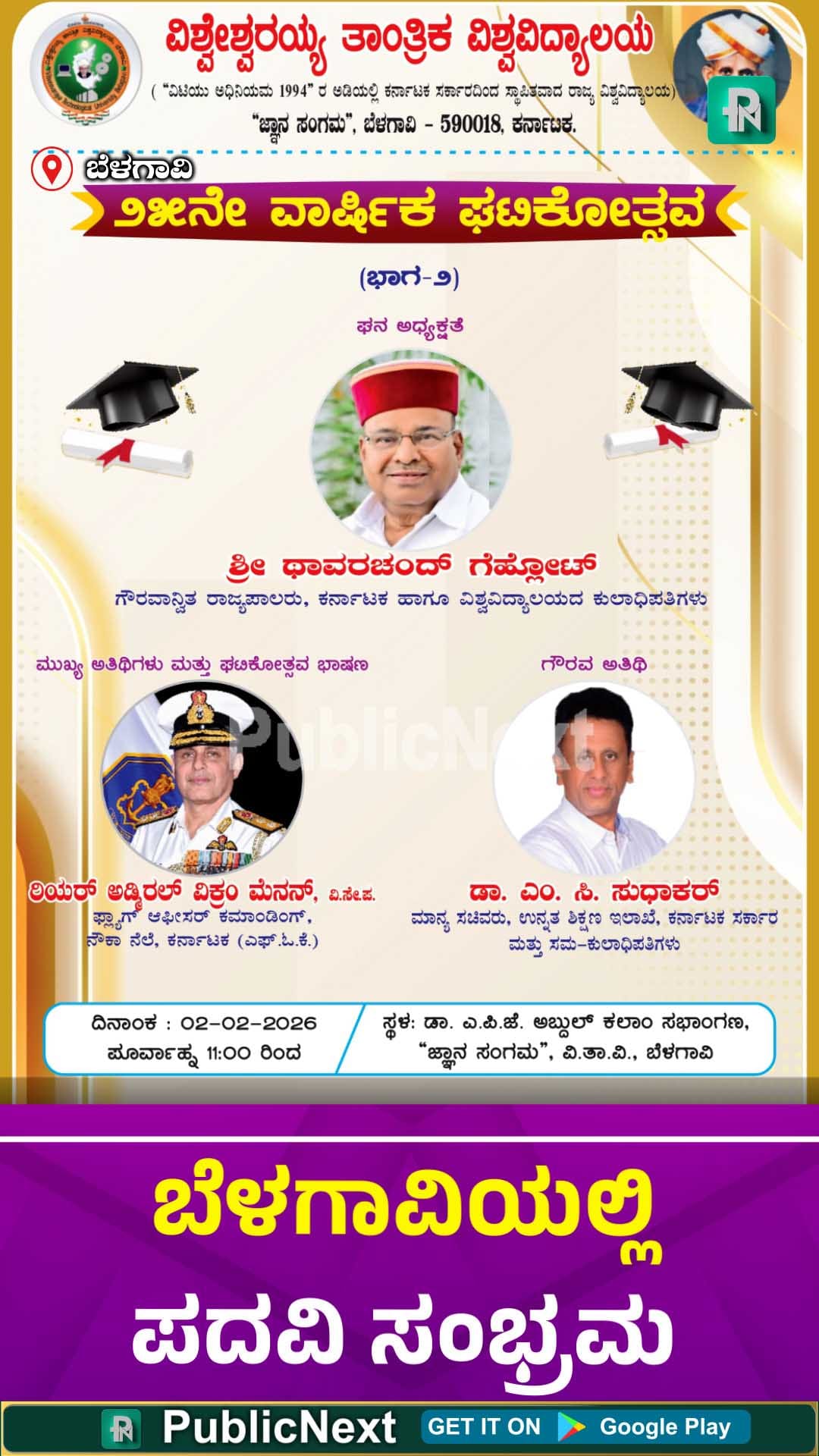 ಬೆಳಗಾವಿ: ವಿಶ್ವೇಶ್ವರಯ್ಯ ತಾಂತ್ರಿಕ ವಿಶ್ವವಿದ್ಯಾಲಯ (ವಿಟಿಯು) ತನ್ನ 25ನೇ ವಾರ್ಷಿಕ ಘಟಿಕೋತ್ಸವದ 'ಭಾಗ-2' ನ್ನು ಫೆಬ್ರವರಿ 2 ರಂದು ಶುಕ್ರವಾರ ಬೆಳಿಗ್ಗೆ 11 ಗಂಟೆಗೆ ಆಯೋಜಿಸಿದೆ. ಈ ಮಹತ್ವದ ಪದವಿ ಪ್ರದಾನ ಸಮಾರಂಭವು ಬೆಳಗಾವಿಯ ಜ್ಞಾನ ಸಂಗಮ ಆವರಣದಲ್ಲಿರುವ ಡಾ. ಎ.ಪಿ.ಜೆ. ಅಬ್ದುಲ್ ಕಲಾಂ ಸಭಾಂಗಣದಲ್ಲಿ ನಡೆಯಲಿದೆ.