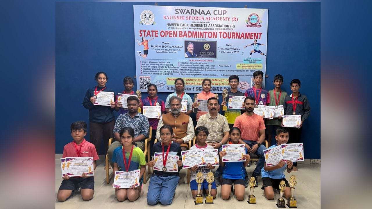 ಹುಬ್ಬಳ್ಳಿ: ಹುಬ್ಬಳ್ಳಿಯ ಸಂಶಿ ಸ್ಪೋರ್ಟ್ಸ್ ಅಕಾಡೆಮಿಯಲ್ಲಿ, ನವೀನ್ ಪಾರ್ಕ್ ನಿವಾಸಿಗಳ ಸಂಘದ ಸಹಯೋಗದೊಂದಿಗೆ, ಎರಡು ದಿನಗಳ ಕಾಲ ನಡೆದ "ಸ್ವರ್ಣಾ ಕಪ್" ರಾಜ್ಯ ಮಟ್ಟದ ಬ್ಯಾಡ್ಮಿಂಟನ್ ಪಂದ್ಯಾವಳಿ ಯಶಸ್ವಿಯಾಗಿ ಸಂಪನ್ನಗೊಂಡಿತು. ಈ ಮಹತ್ವದ ಪಂದ್ಯಾವಳಿಯಲ್ಲಿ ಹಾವೇರಿ, ದಾವಣಗೆರೆ, ಶಿವಮೊಗ್ಗ, ಧಾರವಾಡ, ಉತ್ತರ ಕನ್ನಡ, ಬೆಳಗಾವಿ, ಬಳ್ಳಾರಿ, ಗದಗ, ಹೊಸಪೇಟೆ, ರಾಯಚೂರು ಸೇರಿದಂತೆ ರಾಜ್ಯದ ವಿವಿಧ ಜಿಲ್ಲೆಗಳಿಂದ ಒಟ್ಟು 105 ಯುವ ಕ್ರೀಡಾಪಟುಗಳು ಉತ್ಸಾಹದಿಂದ ಭಾಗವಹಿಸಿದ್ದರು.