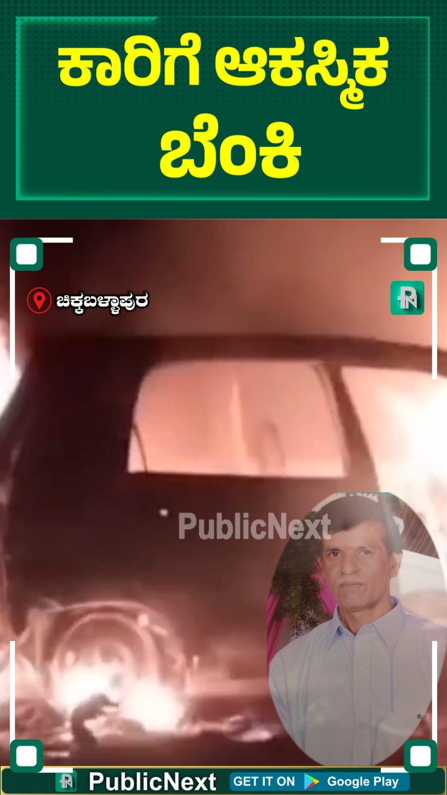ಚಿಕ್ಕಬಳ್ಳಾಪುರ ಜಿಲ್ಲೆಯ ಬಾಗೇಪಲ್ಲಿ ತಾಲ್ಲೂಕಿನ ಆಚೆಪಲ್ಲಿ ಕ್ರಾಸ್ ಬಳಿ ಈ ದುರ್ಘಟನೆ ನಡೆದಿದೆ. ನೋಡ ನೋಡುತ್ತಿದ್ದಂತೆಯೇ ಬೆಂಕಿ ಹೊತ್ತಿಕೊಂಡ ಕಾರಿನಲ್ಲಿದ್ದ ಪೆನುಮಲೆ ಗ್ರಾಮದ 70 ವರ್ಷದ ಉದಯ ಕುಮಾರ್ ಮೃತ ಪಟ್ಟಿದ್ದಾನೆ.