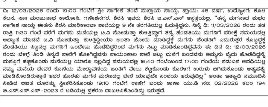 ಶಿರಸಿ: ಮನೆಯಲ್ಲಿ ಮೊಬೈಲ್, ಟಿವಿ ನೋಡುತ್ತಾ ಕಾಲ ಕಳೆಯುತಿದ್ದ ಮಗನಿಗೆ ತಾಯಿ ಬುದ್ದಿವಾದ ಹೇಳಿದ್ದಕ್ಕೆ ಮಗ ತಾಯಿಗೆ ಎದರು ಉತ್ತರ ಕೊಟ್ಟಿದ್ದ .ಈ ಹಿನ್ನಲೆಯಲ್ಲಿ ತಾಯಿ ಮಗನಿಗೆ ಎರಡು ಹೊಡತ ಕೊಟ್ಟು ಓದಿಕೊಳ್ಳುವಂತೆ ಬುದ್ಧಿವಾದ ಹೇಳಿದ್ದಕ್ಕೆ ಮನನೊಂದು 9ನೇ ತರಗತಿ ವಿದ್ಯಾರ್ಥಿ ನೇಣಿಗೆ ಶರಣಾದ ಘಟನೆ ಉತ್ತರ ಕನ್ನಡ ಜಿಲ್ಲೆಯ ಶಿರಸಿ ಗಣೇಶನಗರದಲ್ಲಿ ಸಂಬವಿಸಿದೆ.