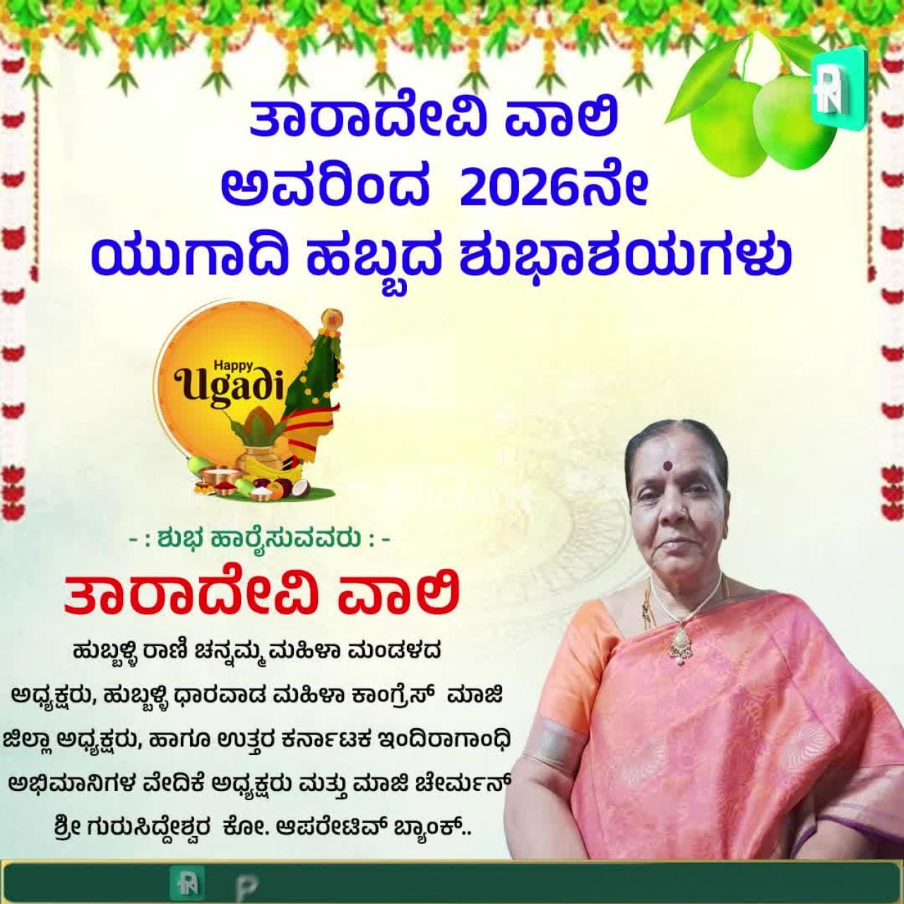 ಈ ಶುಭಾಶಯಗಳನ್ನು ಹುಬ್ಬಳ್ಳಿ ರಾಣಿ ಚನ್ನಮ್ಮ ಮಹಿಳಾ ಮಂಡಳದ ಅಧ್ಯಕ್ಷರು, ಹುಬ್ಬಳ್ಳಿ-ಧಾರವಾಡ ಮಹಿಳಾ ಕಾಂಗ್ರೆಸ್ನ ಮಾಜಿ ಜಿಲ್ಲಾ ಅಧ್ಯಕ್ಷರು, ಉತ್ತರ ಕರ್ನಾಟಕ ಇಂದಿರಾಗಾಂಧಿ ಅಭಿಮಾನಿಗಳ ವೇದಿಕೆಯ ಅಧ್ಯಕ್ಷರು ಹಾಗೂ ಶ್ರೀ ಗುರುಸಿದ್ದೇಶ್ವರ ಕೋ-ಆಪರೇಟಿವ್ ಬ್ಯಾಂಕ್ನ ಮಾಜಿ ಚೇರ್ಮನ್ ಆದ ತಾರಾದೇವಿ ವಾಲಿ ಅವರು ತಿಳಿಸಿದ್ದಾರೆ.