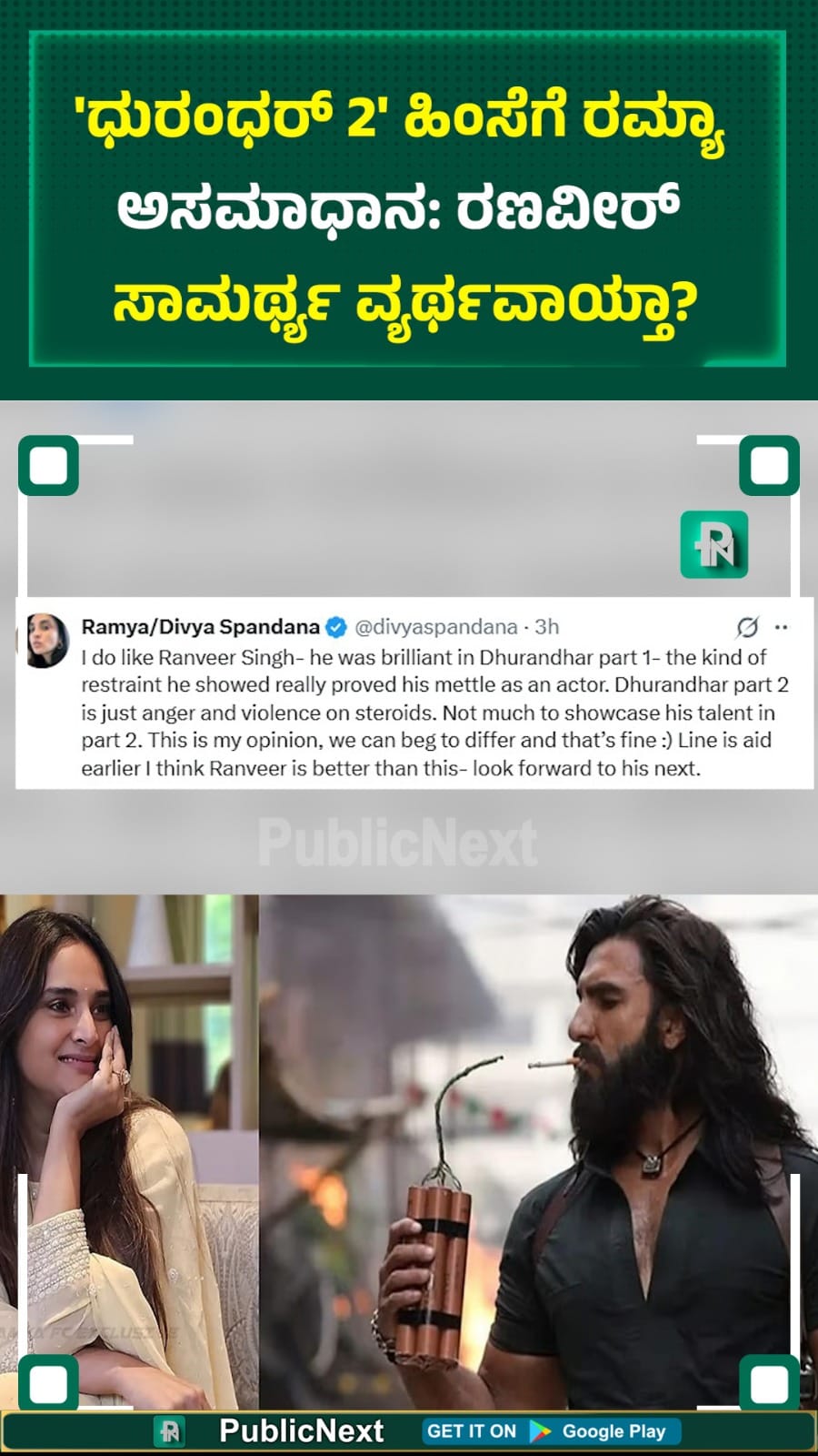 ಇದೇ ವೇಳೆ ನಟ ರಣವೀರ್ ಸಿಂಗ್ ಅವರ ಅಭಿನಯದ ಕುರಿತಂತೆಯೂ ರಮ್ಯಾ ತಮ್ಮ ಅಭಿಪ್ರಾಯ ಹಂಚಿಕೊಂಡಿದ್ದಾರೆ. "ನನಗೆ ರಣವೀರ್ ಸಿಂಗ್ ಇಷ್ಟ. ಅವರು 'ಧುರಂಧರ್ ಭಾಗ 1' ರಲ್ಲಿ ಅದ್ಭುತವಾಗಿ ನಟಿಸಿದ್ದರು. ಅವರ ಸಂಯಮವು ನಟನಾಗಿ ಅವರ ಸಾಮರ್ಥ್ಯವನ್ನು ನಿಜವಾಗಿಯೂ ಸಾಬೀತುಪಡಿಸಿದೆ. ಆದರೆ, 'ಧುರಂಧರ್ 2'ನಲ್ಲಿ ಅತಿಯಾದ ಕೋಪ ಮತ್ತು ಹಿಂಸೆಗೆ ಹೆಚ್ಚು ಪ್ರಾಮುಖ್ಯತೆ ನೀಡಿರುವುದರಿಂದ ಅವರ ಪ್ರತಿಭೆಯನ್ನು ಪೂರ್ಣವಾಗಿ ಬಳಸಿಕೊಳ್ಳಲಾಗಿಲ್ಲ" ಎಂದು ಅಭಿಪ್ರಾಯಪಟ್ಟಿದ್ದಾರೆ. "ರಣವೀರ್ ಇನ್ನೂ ಉತ್ತಮವಾಗಿ ನಟಿಸಬಲ್ಲವರು. ಅವರಿಂದ ಇನ್ನಷ್ಟು ಉತ್ತಮ ಪ್ರದರ್ಶನವನ್ನು ನಿರೀಕ್ಷಿಸುತ್ತಿದ್ದೇನೆ. ಅವರ ಮುಂದಿನ ಚಿತ್ರಕ್ಕಾಗಿ ಎದುರು ನೋಡುತ್ತಿದ್ದೇನೆ" ಎಂದು ತಿಳಿಸಿದ್ದಾರೆ.