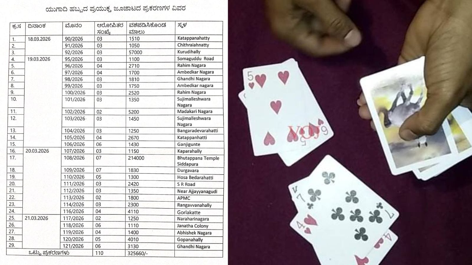 ಚಳ್ಳಕೆರೆ: ಯುಗಾದಿ ಹಬ್ಬದ ನೆಪದಲ್ಲಿ ತಾಲೂಕಿನಾದ್ಯಂತ ನಡೆಯುತ್ತಿದ್ದ ಇಸ್ಪೀಟ್ ಅಡ್ಡೆಗಳ ಮೇಲೆ ಚಳ್ಳಕೆರೆ ಪೊಲೀಸರು ದಾಳಿ ನಡೆಸಿದ್ದಾರೆ. ಇಸ್ಪೀಟ್ ಆಟಕ್ಕೆ ಕಡಿವಾಣ ಹಾಕಲು ಪೊಲೀಸರು ಹಲವು ಕ್ರಮಗಳನ್ನು ಕೈಗೊಂಡಿದ್ದರೂ ಸಹ, ತಾಲೂಕಿನ ವಿವಿಧೆಡೆ ಗುಂಪು ಕಟ್ಟಿಕೊಂಡು ಅಕ್ರಮವಾಗಿ ಇಸ್ಪೀಟ್ ಆಡಲಾಗುತ್ತಿತ್ತು. ಯುಗಾದಿ ಹಬ್ಬದ ಆರಂಭದಿಂದ ಇಲ್ಲಿಯವರೆಗೆ 110 ಮಂದಿಯನ್ನು ಬಂಧಿಸಿ, ₹3,25,660 ನಗದನ್ನು ವಶಪಡಿಸಿಕೊಳ್ಳಲಾಗಿದೆ. ಈ ಸಂಬಂಧ 29 ಪ್ರಕರಣಗಳನ್ನು ದಾಖಲಿಸಿಕೊಂಡು ತನಿಖೆ ಮುಂದುವರೆಸಲಾಗಿದೆ.