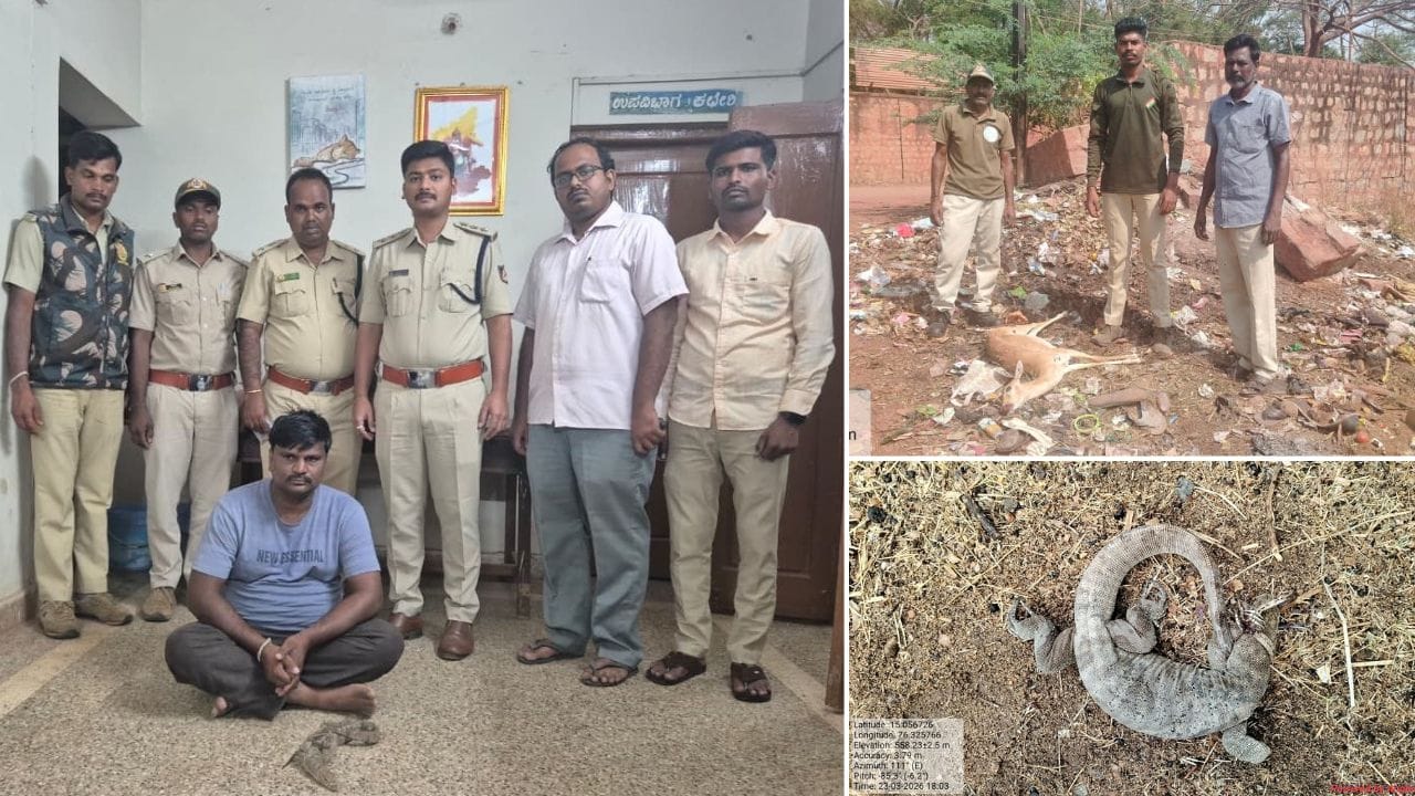 ಹೊಸಪೇಟೆ: ವಿಜಯನಗರ ಜಿಲ್ಲೆಯ ಹೊಸಪೇಟೆಯಲ್ಲಿ ವನ್ಯಜೀವಿಗಳಿಗೆ ಸಂಬಂಧಿಸಿದ ಎರಡು ಪ್ರತ್ಯೇಕ ಘಟನೆಗಳು ಬೆಳಕಿಗೆ ಬಂದಿವೆ. ತಾಲೂಕಿನಲ್ಲಿ ಕೃಷ್ಣಮೃಗವೊಂದು ಅಸಹಜವಾಗಿ ಸಾವನ್ನಪ್ಪಿರುವುದು ಒಂದು ಕಡೆಯಾದರೆ, ಮತ್ತೊಂದೆಡೆ ಜೀವಂತ ಉಡ ಸಾಗಿಸುತ್ತಿದ್ದ ವ್ಯಕ್ತಿಯನ್ನು ಅರಣ್ಯ ಇಲಾಖೆ ಬಂಧಿಸಿದೆ.