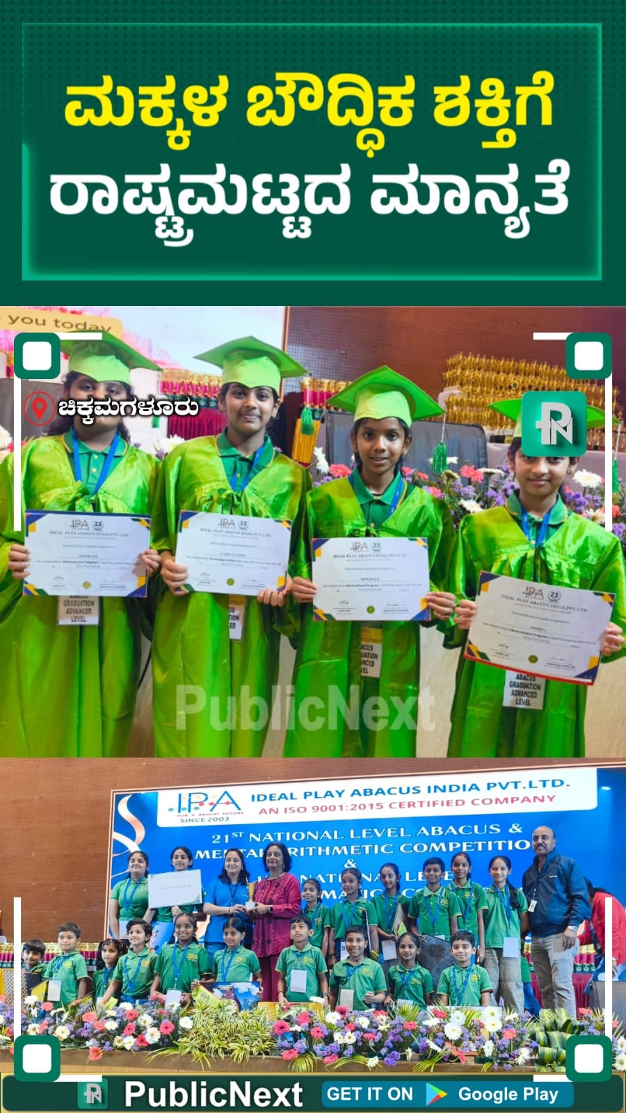 ನಗರದ ಬೈಪಾಸ್ ರಸ್ತೆಯ ಕಲ್ಯಾಣ ನಗರ ಅಬಾಕಸ್ ಸೆಂಟರ್ನ ಒಟ್ಟು 30 ವಿದ್ಯಾರ್ಥಿಗಳು 21ನೇ ರಾಷ್ಟ್ರಮಟ್ಟದ ಅಬಾಕಸ್ ಹಾಗೂ ಸ್ಪೀಡ್ ಅರ್ಥ್ಮೆಟಿಕ್ ಸ್ಪರ್ಧೆಯಲ್ಲಿ ಪಾಲ್ಗೊಂಡು ತಮ್ಮ ಅದ್ಭುತ ಬೌದ್ಧಿಕ ಶಕ್ತಿಯನ್ನು ಪ್ರದರ್ಶಿಸಿದ್ದಾರೆ. ಈ ಪ್ರತಿಭಾವಂತ ತಂಡವು ಒಟ್ಟಾರೆಯಾಗಿ 6 ಚಾಂಪಿಯನ್ ಶಿಪ್ ಪ್ರಶಸ್ತಿಗಳು, 8 ಪ್ರಥಮ ಬಹುಮಾನ, 10 ದ್ವಿತೀಯ ಬಹುಮಾನ ಹಾಗೂ 6 ತೃತೀಯ ಬಹುಮಾನಗಳನ್ನು ಬಾಚಿಕೊಳ್ಳುವ ಮೂಲಕ ರಾಷ್ಟ್ರಮಟ್ಟದಲ್ಲಿ ಕಾಫಿನಾಡಿನ ಕೀರ್ತಿ ಪತಾಕೆಯನ್ನು ಹಾರಿಸಿದೆ.