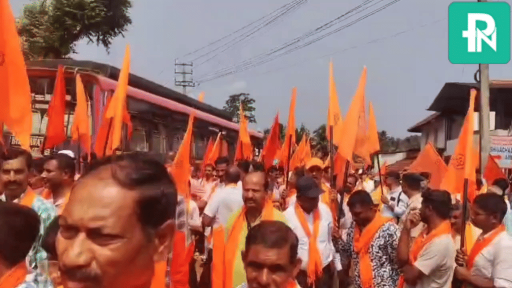 ಕೊಡಗು : ಕಳೆದ ಕೆಲ ತಿಂಗಳ ಹಿಂದೆ ಹಿಂದೂ ಸಂಗಮ ಕಾರ್ಯಕ್ರಮಕ್ಕೆ ಊರಿನ ಪ್ರಮುಖ ರಸ್ತೆಗಳಲ್ಲಿ ದ್ವನಿ ವರ್ಧಕವನ್ನು ಬಳಸಿಕೊಂಡು ಪ್ರಚಾರ ಮಾಡುವ ಸಂದರ್ಭದಲ್ಲಿ ಕೆಲ ಮುಸ್ಲಿಂ ಯುವಕರು ಹಿಂದೂ ಕಾರ್ಯಕರ್ತರ ಮೇಲೆ ಹಲ್ಲೆ ನಡೆಸಿದ್ರು. ಈ ಹಿನ್ನೆಲೆಯಲ್ಲಿ ಅದೇ ಈ ಊರಿನಲ್ಲಿ ಹಿಂದೂಗಳ ಶಕ್ತಿ ಪ್ರದರ್ಶನವನ್ನು ಮಾಡುತ್ತೇವೆ ಎಂದು ಹಿಂದೂ ಕಾರ್ಯಕರ್ತರು ಸವಾಲು ಹಾಕಿದ್ರು ಅದರಂತೆ ನಾಪೋಕ್ಲು ಪಟ್ಟಣದಲ್ಲಿ ಸುಮಾರು ಎರಡು ಸಾವಿರಕ್ಕೂ ಅದಿಕ ಹಿಂದೂ ಕಾರ್ಯಕರ್ತರು ನಾಪೋಕ್ಲು ಪಟ್ಟಣದ ಪ್ರಮುಖ ರಸ್ತೆಗಳಲ್ಲಿ ಮೆರವಣಿಗೆ ಮೂಲಕ ಸಾಗಿ ಹಿಂದೂಗಳ ಶಕ್ತಿ ಪ್ರದರ್ಶನ ತೋರಿದ್ರು.
