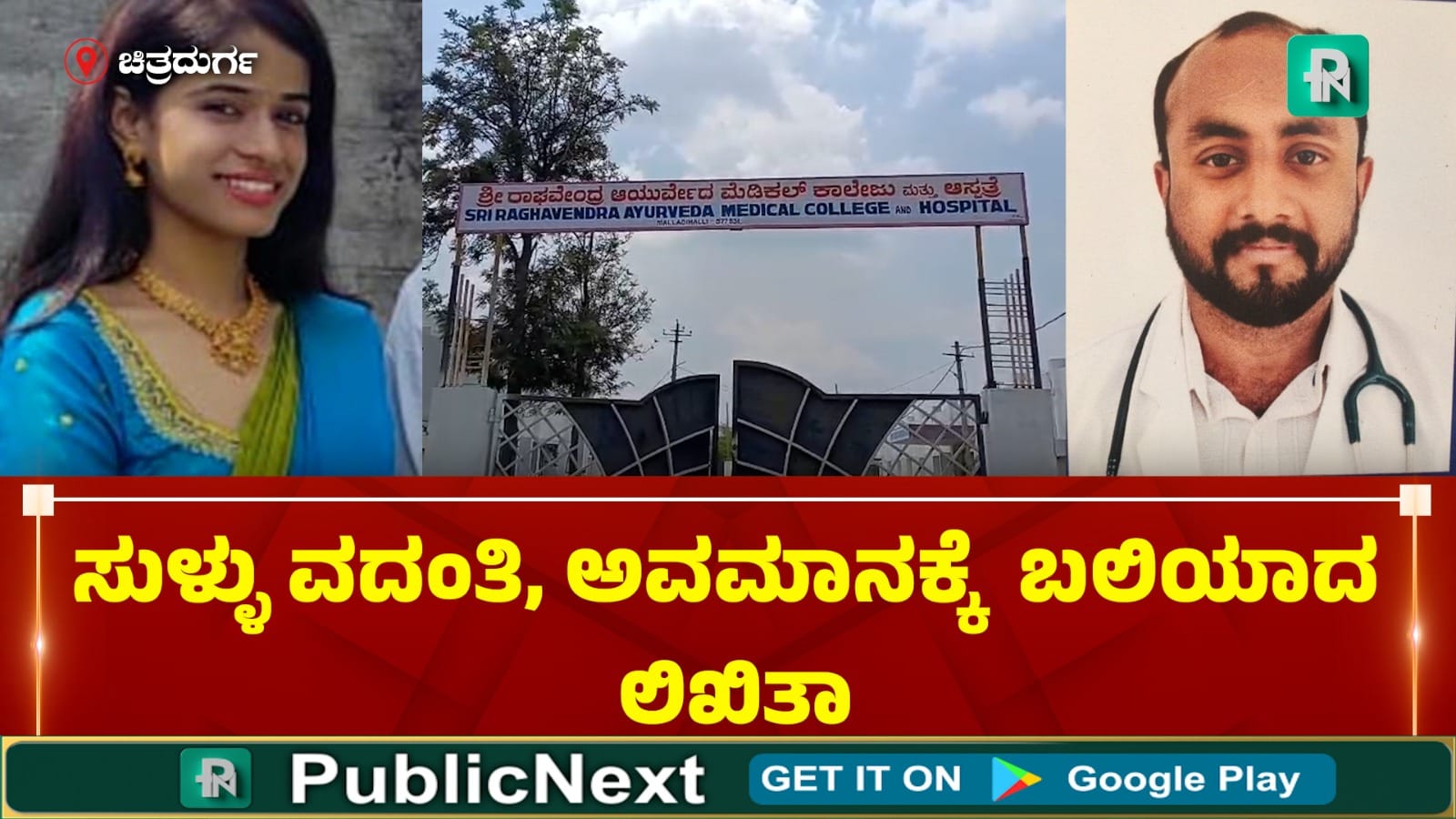 ಚಿತ್ರದುರ್ಗ: ಹೀಗೆ ಮನೆಯಲ್ಲೇ ನೇಣು ಬಿಗಿದುಕೊಂಡು ಆತ್ಮಹತ್ಯೆಗೆ ಶರಣಾಗಿರೋ ಯುವತಿ ಹೆಸರು 22 ವರ್ಷದ ಲಿಖಿತ. ಚಿತ್ರದುರ್ಗ ಜಿಲ್ಲೆಯ ಹೊಳಲ್ಕೆರೆ ತಾಲ್ಲೂಕಿನ ಆರ್. ನುಲೇನೂರು ನಿವಾಸಿ. ಕಳೆದ ಮೂರ್ನಾಕು ವರ್ಷಗಳಿಂದ ಮಲ್ಲಾಡಿಹಳ್ಳಿ ರಾಘವೇಂದ್ರ ಆಯುರ್ವೇದ ಕಾಲೇಜಿನಲ್ಲಿ BMS ಕೋರ್ಸ್ ಓದುತ್ತಿದ್ದಳು. ಆದ್ರೆ ಕೆಲ ತಿಂಗಳಿಂದ ಅದೇ ಕಾಲೇಜಿನಲ್ಲಿ BMS ಕೋರ್ಸ್ ಮುಗಿಸಿ ಇಂಟರ್ನ್ಶಿಪ್ ಮಾಡುತ್ತಿದ್ದಳು. ಇದೇ ವೇಳೆ ಕಾಲೇಜಿನಲ್ಲಿ ಉಪನ್ಯಾಸಕ ಡಾ. ರಾಜು ಜೊತೆ ಸಲುಗೆಯಿಂದ ಮಾತನಾಡುತ್ತಿದ್ದರು. ಅಲ್ಲದೇ BMS ಕೋರ್ಸ್ ವಿಷಯದಲ್ಲಿ ಕೆಲ ಡೌಟ್ ಗಳಿಗೂ ಡಾ.ರಾಜು ಬಳಿ ಪರಿಹಾರ ಕೇಳುತ್ತಿದ್ದಳು. ಆದ್ರೆ ಇದನ್ನೇ ಬಂಡವಾಳ ಮಾಡಿಕೊಂಡಿದ್ದ ಲಿಖಿತಾಳ ಸ್ನೇಹಿತರು, ಇಬ್ಬರ ನಡುವೆ ಅಕ್ರಮ ಸಂಬಂಧ ಇದೆ ಅಂತ ಪುಕಾರ ಹಬ್ಬಿಸಿದ್ದರು. ಕಾಲೇಜು ತುಂಬಾ ಲಿಖಿತ ಹಾಗೂ ಡಾ.ರಾಜು ನಡುವೆ ಲವ್ವಿ- ಡವ್ವಿ ನಡೀತಾ ಇದೆ ಅಂತ ಸುಳ್ಳು ಸುದ್ದಿ ಹಬ್ಬಿಸಿದ್ದರು. ಇದೇ ವಿಷಯವನ್ನ ಈಕೆಯ ಸಹಪಾಠಿಗಳಾದ ಅನುಷಾ, ರಕ್ಷಾ, ಚಿನ್ಮಯಿ ಹಾಗೂ ಸಾಗರ್ ಉಪನ್ಯಾಸಕ ಡಾ.ರಾಜು ಪತ್ನಿಗೂ ಹೇಳಿದ್ದರು. ಇದೇ ವಿಚಾರಕ್ಕೆ ಡಾ.ರಾಜು ಪತ್ನಿ ನಿಶಾ ಕೂಡಾ ಲಿಖಿತ ವಿರುದ್ಧ ಗರಂ ಆಗಿದ್ದಳು. ಕಳೆದ ಕೆಲ ದಿನಗಳ ಹಿಂದೆ ಡಾ.ರಾಜು ಪತ್ನಿ ನಿಶಾ ಕಾಲೇಜಿಗೆ ಬಂದು ಸ್ನೇಹಿತರ ಮುಂದೆ ಗಲಾಟೆ ಮಾಡಿ ಹೋಗಿದ್ದಳು. ಇದೇ ವಿಷಯ ವಿದ್ಯಾರ್ಥಿನಿ ಲಿಖಿತ ಮನಸ್ಸಿಗೆ ನೋವು ಉಂಟು ಮಾಡಿತ್ತು. ಇದೇ ಅವಮಾನಕ್ಕೆ ಲಿಖಿತ ಆತ್ಮಹತ್ಯೆಗೆ ಶರಣಾಗಿದ್ದಾಳೆ.