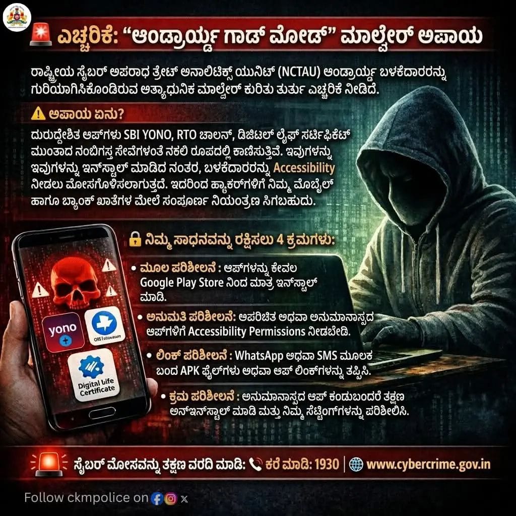 ಈ ಮಾಲ್ವೇರ್ ಎಸ್ಬಿಐ ಯೋನೋ, ಆರ್ಟಿಒ ಚಾಲನ್ ಮತ್ತು ಡಿಜಿಟಲ್ ಲೈಫ್ ಸರ್ಟಿಫಿಕೇಟ್ಗಳಂತಹ ಅಧಿಕೃತ ಆಪ್ಗಳ ರೂಪದಲ್ಲಿ ಕಾಣಿಸಿಕೊಳ್ಳುತ್ತಿದ್ದು, ಬಳಕೆದಾರರು ಇವುಗಳನ್ನು ಡೌನ್ಲೋಡ್ ಮಾಡಿದ ತಕ್ಷಣ ಅಕ್ಸೆಸಿಬಿಲಿಟಿ ಅನುಮತಿಗಳನ್ನು ಪಡೆದುಕೊಂಡು ಫೋನ್ ಹಾಗೂ ಬ್ಯಾಂಕ್ ಖಾತೆಗಳ ಮೇಲೆ ಸಂಪೂರ್ಣ ನಿಯಂತ್ರಣ ಸಾಧಿಸುತ್ತವೆ. ಈ ಹಿನ್ನೆಲೆಯಲ್ಲಿ ಸಾರ್ವಜನಿಕರು ಕೇವಲ ಗೂಗಲ್ ಪ್ಲೇ ಸ್ಟೋರ್ನಿಂದ ಮಾತ್ರ ಆಪ್ಗಳನ್ನು ಇನ್ಸ್ಟಾಲ್ ಮಾಡಬೇಕು ಮತ್ತು ವಾಟ್ಸಾಪ್ ಅಥವಾ ಎಸ್ಎಮ್ಎಸ್ ಮೂಲಕ ಬರುವ ಅಪರಿಚಿತ ಎಪಿಕೆ ಲಿಂಕ್ಗಳನ್ನು ಕ್ಲಿಕ್ ಮಾಡಬಾರದು ಎಂದು ಸೂಚಿಸಲಾಗಿದೆ. ಒಂದು ವೇಳೆ ಮೊಬೈಲ್ನಲ್ಲಿ ಅನುಮಾನಾಸ್ಪದ ಚಟುವಟಿಕೆ ಕಂಡುಬಂದಲ್ಲಿ ಕೂಡಲೇ ಸೈಬರ್ ಹೆಲ್ಪ್ಲೈನ್ ಸಂಖ್ಯೆ 1930 ಅಥವಾ www.cybercrime.gov.in ಮೂಲಕ ದೂರು ದಾಖಲಿಸುವಂತೆ ಜಿಲ್ಲಾ ಪೊಲೀಸ್ ಇಲಾಖೆ ತಿಳಿಸಿದೆ.