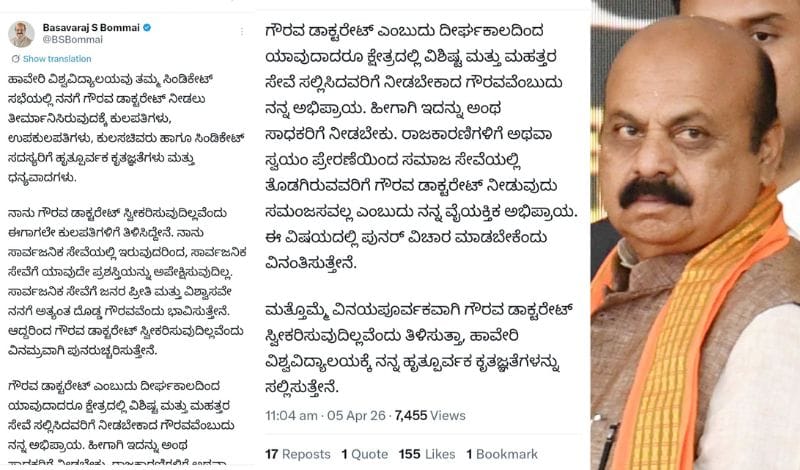 ಹಾವೇರಿ ವಿಶ್ವವಿದ್ಯಾಲಯದ ವತಿಯಿಂದ ನೀಡುತ್ತಿರುವ ಗೌರವ ಡಾಕ್ಟರೇಟನ್ನು ಮಾಜಿ ಸಿಎಂ ಬಸವರಾಜ ಬೊಮ್ಮಾಯಿ ತಿರಸ್ಕರಿಸಿದ್ದಾರೆ. ಈ ಬಗ್ಗೆ X ಖಾತೆಯಲ್ಲಿ ತಿಳಿಸಿರುವ ಸಂಸದ ಬಸವರಾಜ ಬೊಮ್ಮಾಯಿ, ಹಾವೇರಿ ವಿಶ್ವವಿದ್ಯಾಲಯವು ತಮ್ಮ ಸಿಂಡಿಕೇಟ್ ಸಭೆಯಲ್ಲಿ ನನಗೆ ಗೌರವ ಡಾಕ್ಟರೇಟ್ ನೀಡಲು ತೀರ್ಮಾನಿಸಿರುವುದಕ್ಕೆ ಕುಲಪತಿಗಳು, ಉಪಕುಲಪತಿಗಳು, ಕುಲಸಚಿವರು ಹಾಗೂ ಸಿಂಡಿಕೇಟ್ ಸದಸ್ಯರಿಗೆ ಹೃತ್ಪೂರ್ವಕ ಕೃತಜ್ಞತೆಗಳು ಮತ್ತು ಧನ್ಯವಾದಗಳು. ನಾನು ಗೌರವ ಡಾಕ್ಟರೇಟ್ ಸ್ವೀಕರಿಸುವುದಿಲ್ಲವೆಂದು ಈಗಾಗಲೇ ಕುಲಪತಿಗಳಿಗೆ ತಿಳಿಸಿದ್ದೇನೆ. ನಾನು ಸಾರ್ವಜನಿಕ ಸೇವೆಯಲ್ಲಿ ಇರುವುದರಿಂದ, ಸಾರ್ವಜನಿಕ ಸೇವೆಗೆ ಯಾವುದೇ ಪ್ರಶಸ್ತಿಯನ್ನು ಅಪೇಕ್ಷಿಸುವುದಿಲ್ಲ. ಸಾರ್ವಜನಿಕ ಸೇವೆಗೆ ಜನರ ಪ್ರೀತಿ ಮತ್ತು ವಿಶ್ವಾಸವೇ ನನಗೆ ಅತ್ಯಂತ ದೊಡ್ಡ ಗೌರವವೆಂದು ಭಾವಿಸುತ್ತೇನೆ. ಆದ್ದರಿಂದ ಗೌರವ ಡಾಕ್ಟರೇಟ್ ಸ್ವೀಕರಿಸುವುದಿಲ್ಲವೆಂದು ವಿನಮ್ರವಾಗಿ ಪುನರುಚ್ಚರಿಸುತ್ತೇನೆ ಎಂದಿದ್ದಾರೆ.