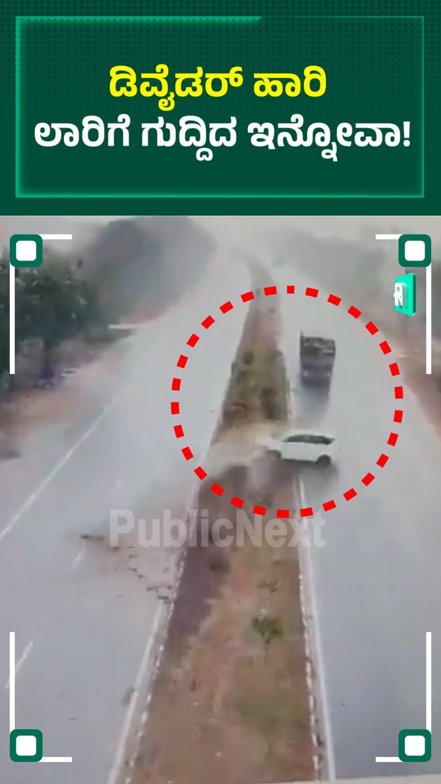 ಭಾನುವಾರ ಸಂಜೆ ಈ ಭಾಗದಲ್ಲಿ ಭಾರೀ ಮಳೆಯಾಗುತ್ತಿತ್ತು. ಹೈವೇಯಲ್ಲಿ ಅತಿ ವೇಗವಾಗಿ ಸಾಗುತ್ತಿದ್ದ ಇನ್ನೋವಾ ಕಾರು, ಮಳೆ ನೀರಿನ ಕಾರಣಕ್ಕೆ ರಸ್ತೆಯ ಮೇಲೆ ದಿಢೀರ್ ಸ್ಕಿಡ್ ಆಗಿದೆ. ನಿಯಂತ್ರಣ ಕಳೆದುಕೊಂಡ ಕಾರು ನೇರವಾಗಿ ಡಿವೈಡರ್ ಹಾರಿ ವಿರುದ್ಧ ದಿಕ್ಕಿನಿಂದ ಬರುತ್ತಿದ್ದ ಲಾರಿಗೆ ಬಲವಾಗಿ ಗುದ್ದಿದೆ. ಡಿಕ್ಕಿಯ ರಭಸಕ್ಕೆ ಕಾರು ರಸ್ತೆಯಿಂದ ಪಕ್ಕಕ್ಕೆ ಎಸೆಯಲ್ಪಟ್ಟಿದೆ.