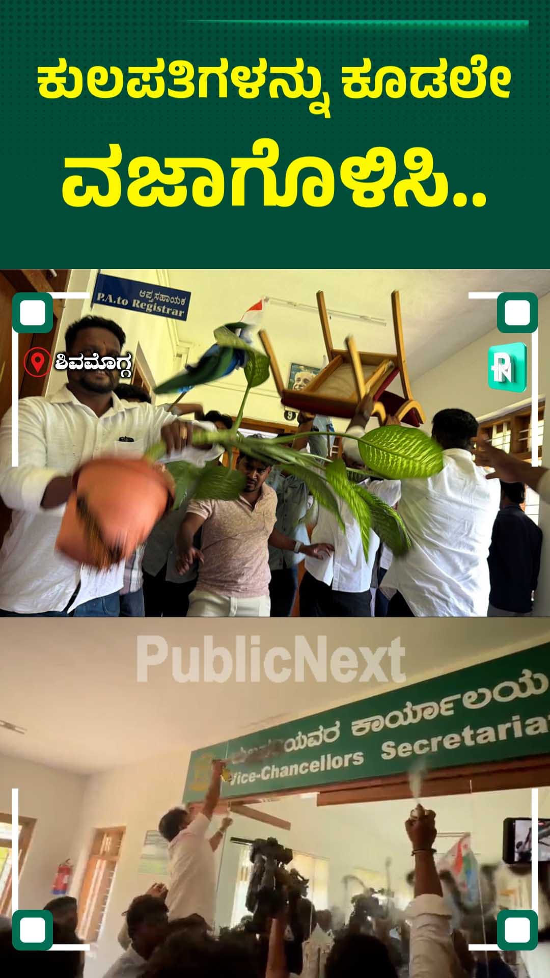 ವಿದ್ಯಾರ್ಥಿಗಳ ಪ್ರತಿಭಟನೆಯು ತೀವ್ರ ಸ್ವರೂಪ ಪಡೆದಿದ್ದು, ಕುಲಪತಿಗಳಾದ ಶರತ್ ಅನಂತಮೂರ್ತಿ ಅವರ ಕಚೇರಿಗೆ ಮುತ್ತಿಗೆ ಹಾಕಿದ ಕಾರ್ಯಕರ್ತರು, ಕಚೇರಿಯ ನಾಮಫಲಕಗಳಿಗೆ ಮಸಿ ಬಳಿದು, ಪೀಠೋಪಕರಣ, ಪಾಟ್ಗಳನ್ನು ಒಡೆದು ಹಾಕುವ ಮೂಲಕ ಆಕ್ರೋಶ ವ್ಯಕ್ತಪಡಿಸಿದರು. ಕುವೆಂಪು ವಿಶ್ವವಿದ್ಯಾಲಯದಲ್ಲಿ ಇತ್ತೀಚೆಗೆ ನಿರಂತರವಾಗಿ ವಿದ್ಯಾರ್ಥಿ ವಿರೋಧಿ ನಡೆ ಅನುಸರಿಸುತ್ತಿದ್ದು, ವಿದ್ಯಾರ್ಥಿಗಳ ಭವಿಷ್ಯದ ಜೊತೆಗೆ ಚೆಲ್ಲಾಟವಾಡುತ್ತಿರುವ ವಿಶ್ವವಿದ್ಯಾಲಯದ ನಡೆಯನ್ನು ಶಿವಮೊಗ್ಗ ಜಿಲ್ಲಾ ಎನ್.ಎಸ್.ಯು.ಐ. ಖಂಡಿಸಿತು.