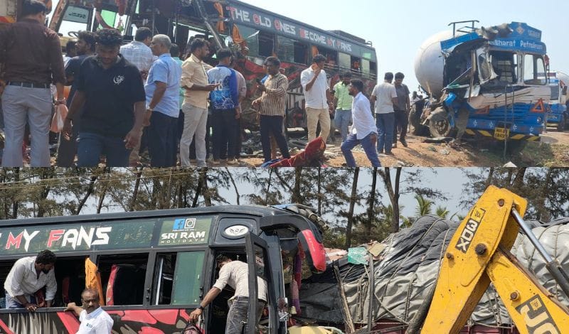 ಬೈಂದೂರು: ಕಾಲೇಜು ಪ್ರವಾಸ ಹೊರಟಿದ್ದ ಬಸ್ಸೊಂದು ರಸ್ತೆ ಬದಿ ನಿಂತಿದ್ದ ಟ್ಯಾಂಕರ್ ಮತ್ತು ಲಾರಿಗೆ ಡಿಕ್ಕಿ ಹೊಡೆದ ಪರಿಣಾಮ ಬಸ್ಸಿನಲ್ಲಿದ್ದ ಮೂವರು ಮೃತಪಟ್ಟ ಘಟನೆ ತ್ರಾಸಿಯ ಮರವಂತೆ ಬೀಚ್ ಬಳಿ ಇಂದು ಮಧ್ಯಾಹ್ನ ವೇಳೆ ಸಂಭವಿಸಿದೆ.