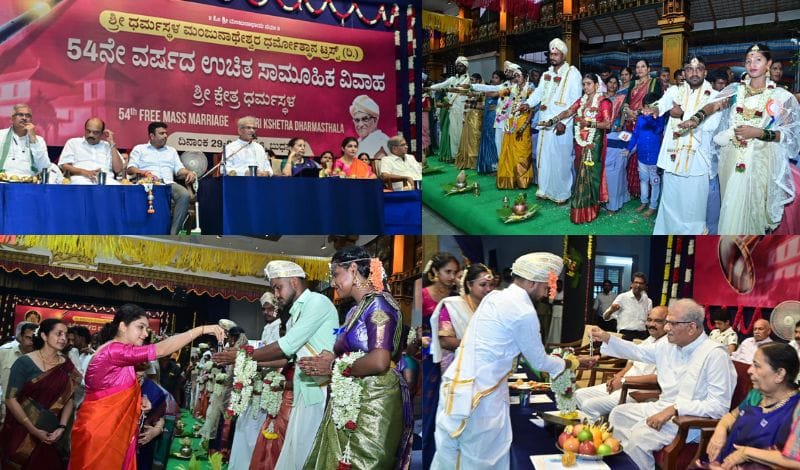 ಬೆಳ್ತಂಗಡಿ: ಶ್ರೀಕ್ಷೇತ್ರ ಧರ್ಮಸ್ಥಳದ ಅಮೃತವರ್ಷಿಣಿ ಸಭಾಭವನದಲ್ಲಿ ಬುಧವಾರ ಸಂಜೆ 6.40ರ ಗೋಧೂಳಿ ಲಗ್ನ ಸುಮುಹೂರ್ತದಲ್ಲಿ ನಡೆದ 54ನೇ ವರ್ಷದ ಉಚಿತ ಸಾಮೂಹಿಕ ವಿವಾಹ ಸಮಾರಂಭದಲ್ಲಿ 109 ಜೋಡಿ ವಧೂ-ವರರು ದಾಂಪತ್ಯ ಜೀವನಕ್ಕೆ ಕಾಲಿರಿಸಿದರು.