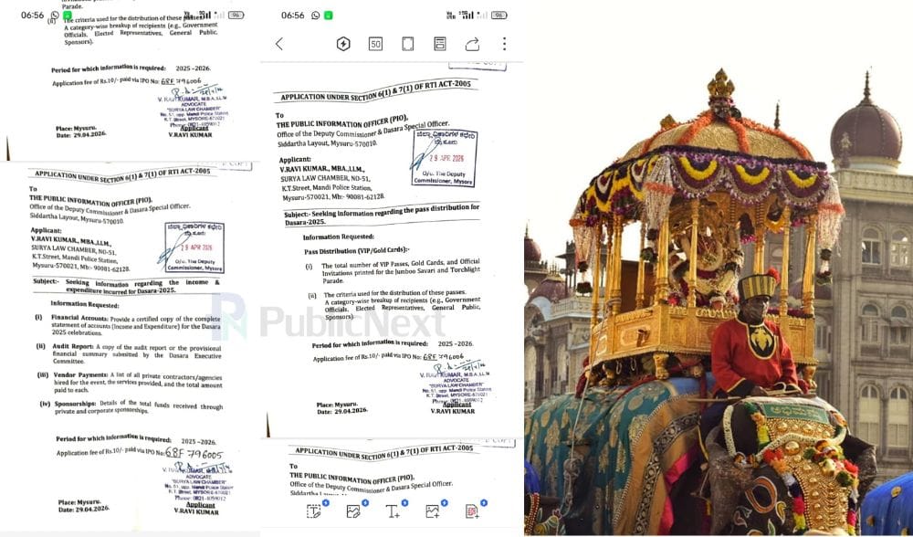 ಮೈಸೂರು: 2025ನೇ ಸಾಲಿನ ದಸರಾದ ಖರ್ಚು ವೆಚ್ಚ ಹಾಗೂ ಗೋಲ್ಡ್ ಪಾಸ್ಗಳ ಸಂಪೂರ್ಣ ಲೆಕ್ಕ ಕೊಡುವಂತೆ ಮೈಸೂರು ಜಿಲ್ಲಾಧಿಕಾರಿಗಳಿಗೆ ವಕೀಲ ರವಿ ಕುಮಾರ್ ಅರ್ಜಿ ಹಾಕಿದ್ದಾರೆ.